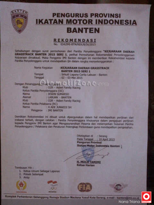 Lebih lanjut Irwin menambahkan, Untuk persiapan Kejurda sudah 70%. Saya yakinkan bahwa event tersebut tetap di gelar pada 2-3 Mei 2015 mendatang. Rekomendasi dari IMI Banten dan surat perijinan dari Kapolres Pandeglang sudah beres dari 1 minggu lalu. Semoga event perdana Kejurda Grasstrack Banten Seri 1 ini bisa kami kemas sebaik-baiknya.