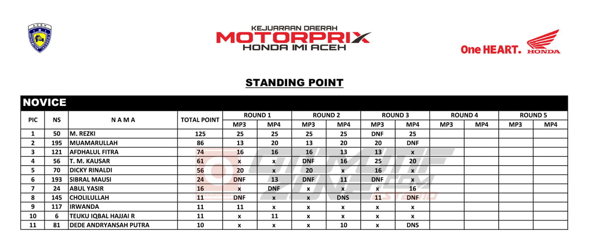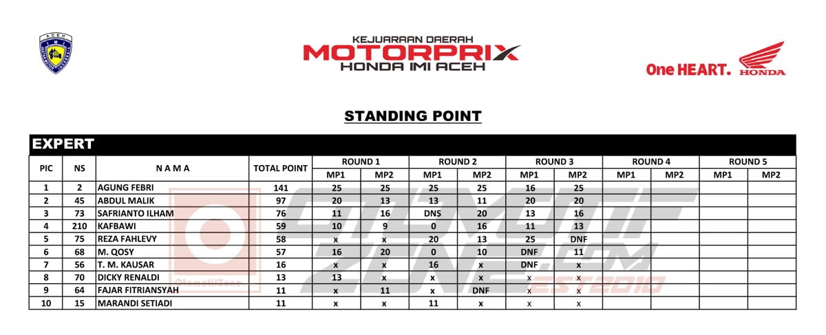 Berikut klasemen Kejurda Motorprix Honda IMI Aceh 2019 hingga seri ke-3 Pidie Jaya.