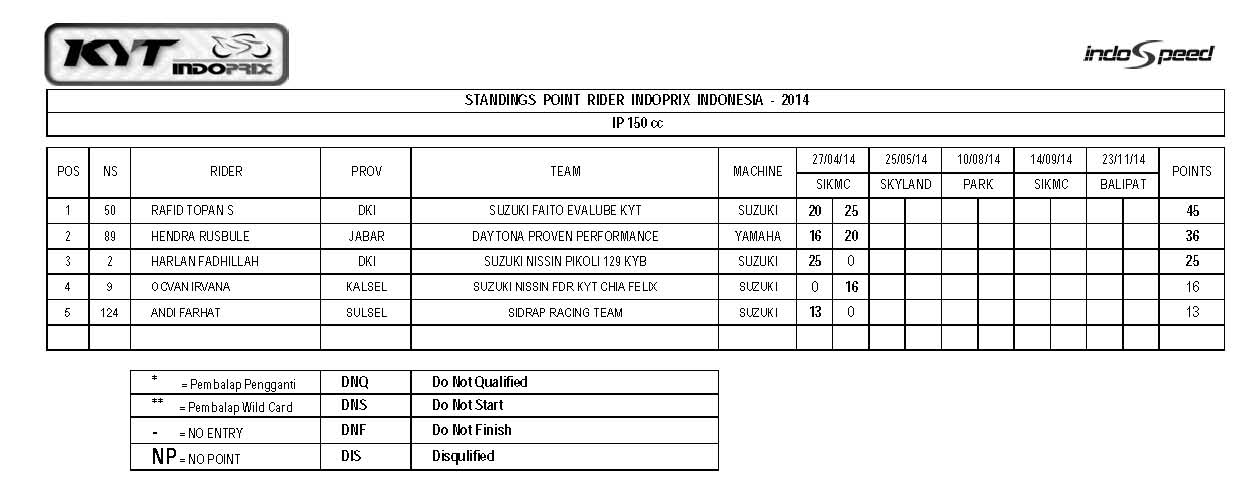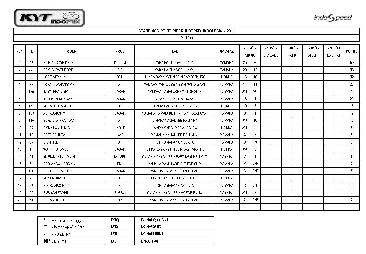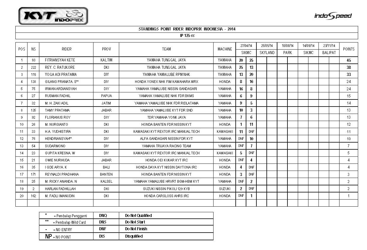 Hingga berakhirnya Indoprix Seri 1, Fitriansyah Kete pembalap asal Kalimantan Timur memimpin klasemen sementara di IP 110cc (45 poin) dan IP 125cc (50 Poin). Sedangkan IP 150 cc, Rafid Topan kokoh dipuncak klasemen dengan 45 poin diikuti Hendra Resbule (36 poin) salah stu pembalap yang menggunakan motor Yamaha diantara 4 pembalap yang menggunakan Suzuki di kelas IP 150cc.