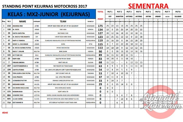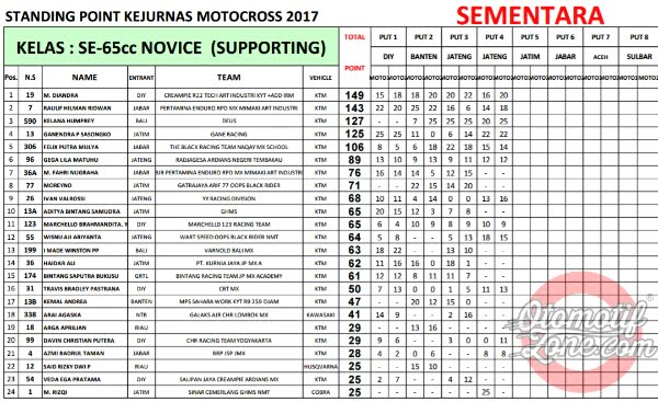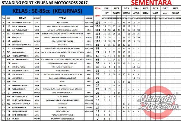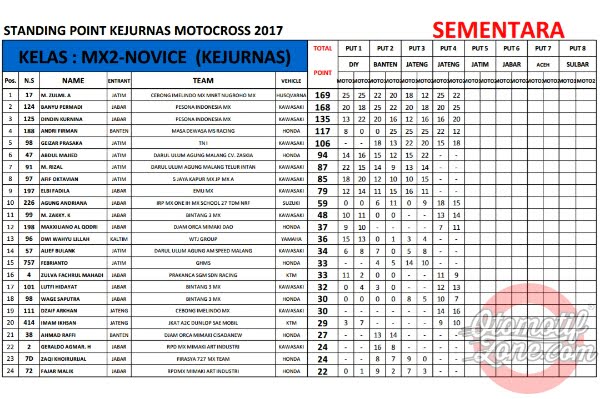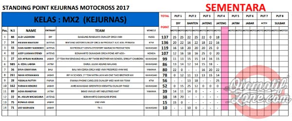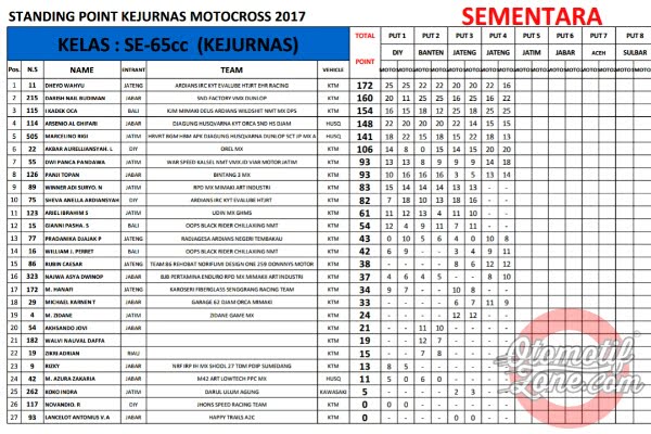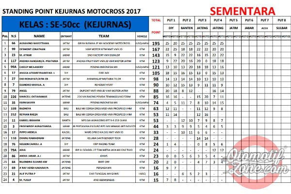 OtomotifZone.com. Seri Kejurnas Motocross memasuki musim jeda tengah musim. Seri Kejurnas yang sempat tertulis 12 seri akhirnya di padatkan menjadi 8 seri saja. Jadi tepat bulan Ramadhan ini seri sudah berjalan 4 seri, setengah musim sudah berjalan. Berikut OZ berikan klasemen sementara Kejurnas Motocross 2017 sampai seri 4.