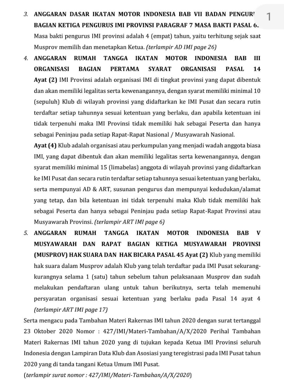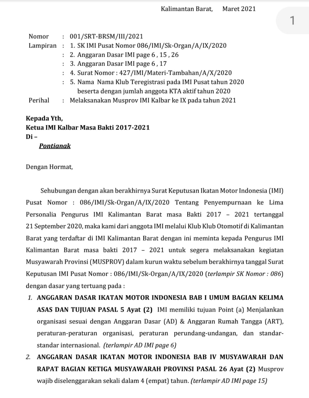 Point point yang tertuang dalam AD ART tersebut menjadi acuan sebagian besar klub yang bernaung dibawah Pengprov IMI Kalimantan Barat mengajukan surat permohonan segera digelar Musprov, hal tersebut dituangkan secara rinci dalam surat tersebut dengan Nomor : 001/SRT-BRSM/III/2021 yang ditetapkan di Pontianak sebagai ibukota Provinsi Kalbar.