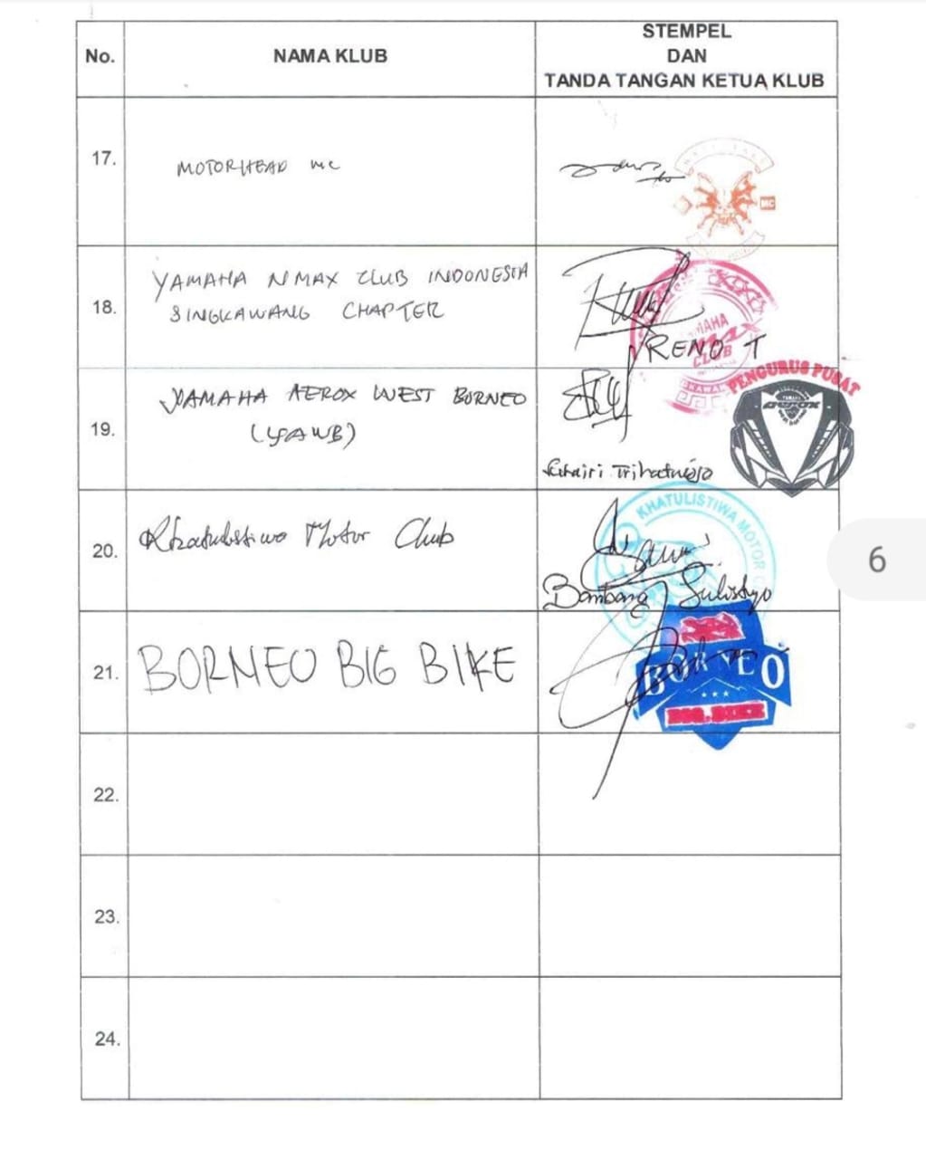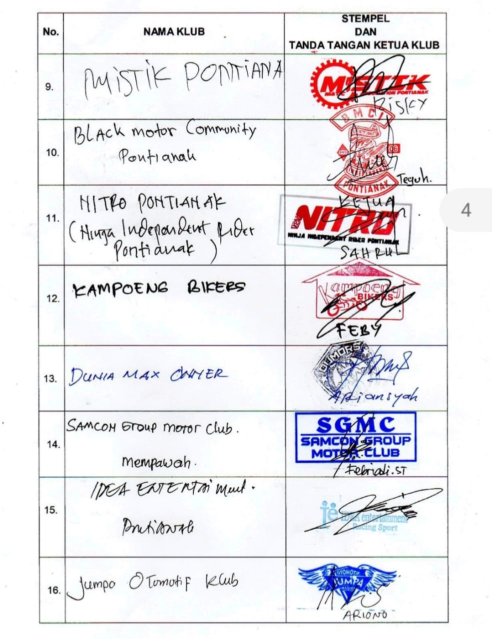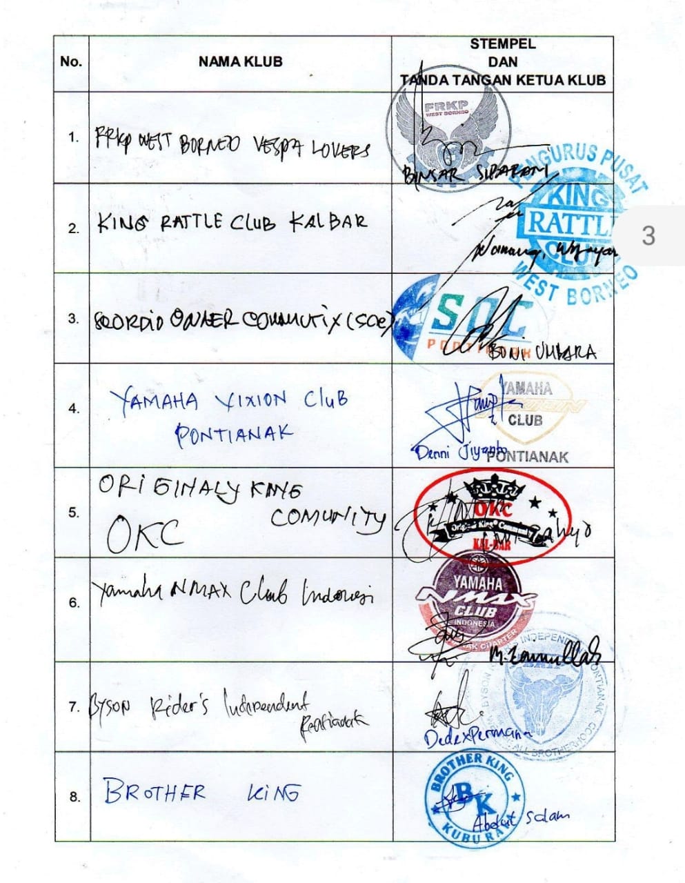 Berikut daftar klub anggota IMI Kalbar yang teregistrasi di IMI Pusat yang menandatangi permohonan segera digelar Musprov IMI Kalbar.