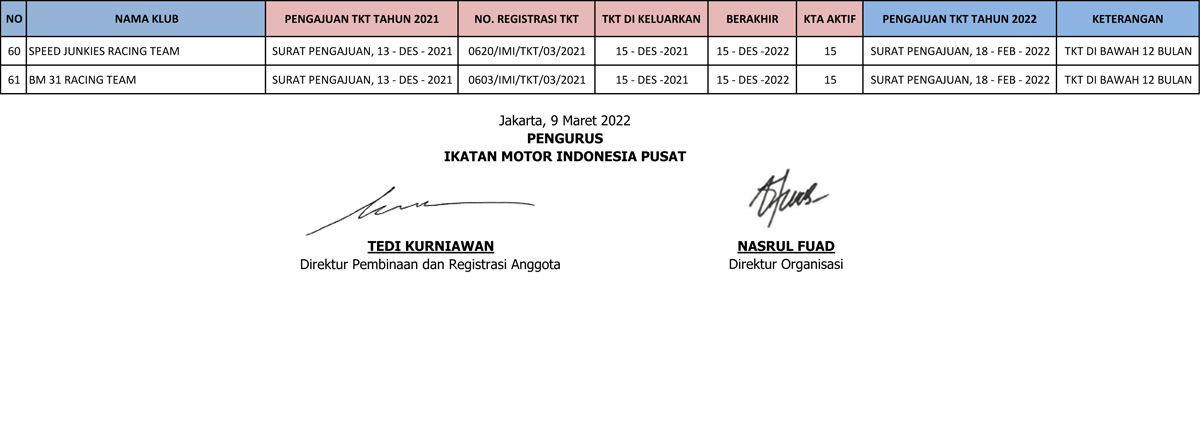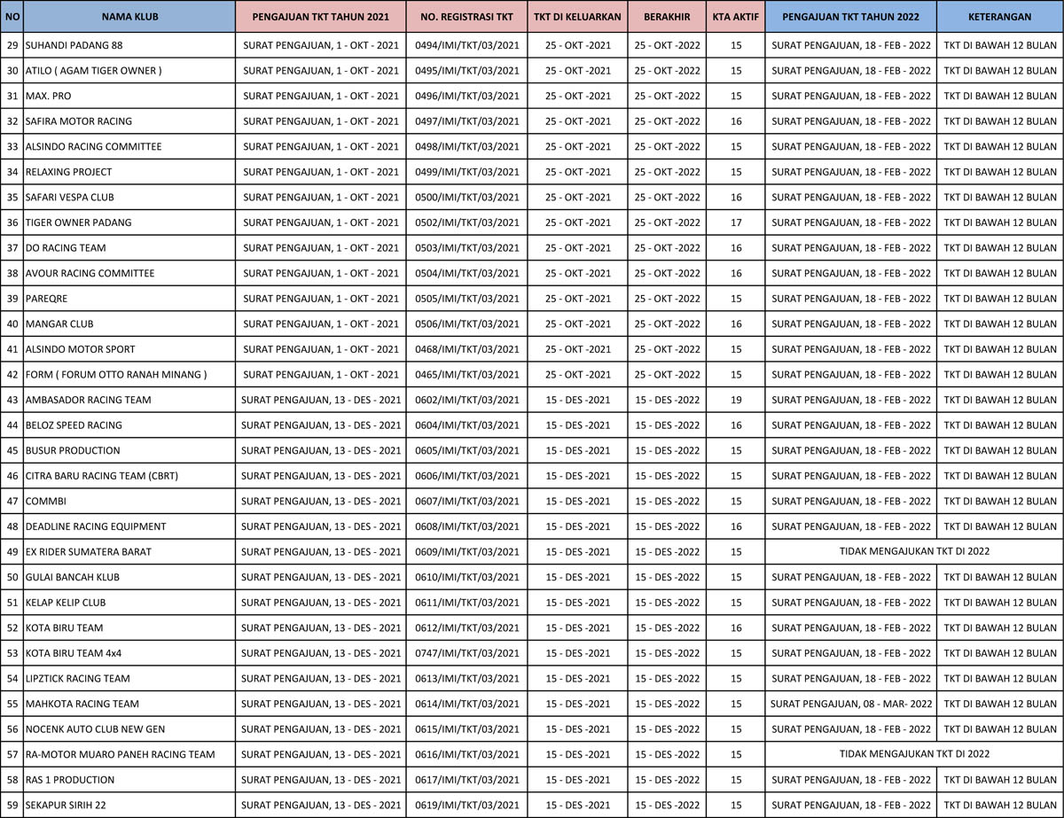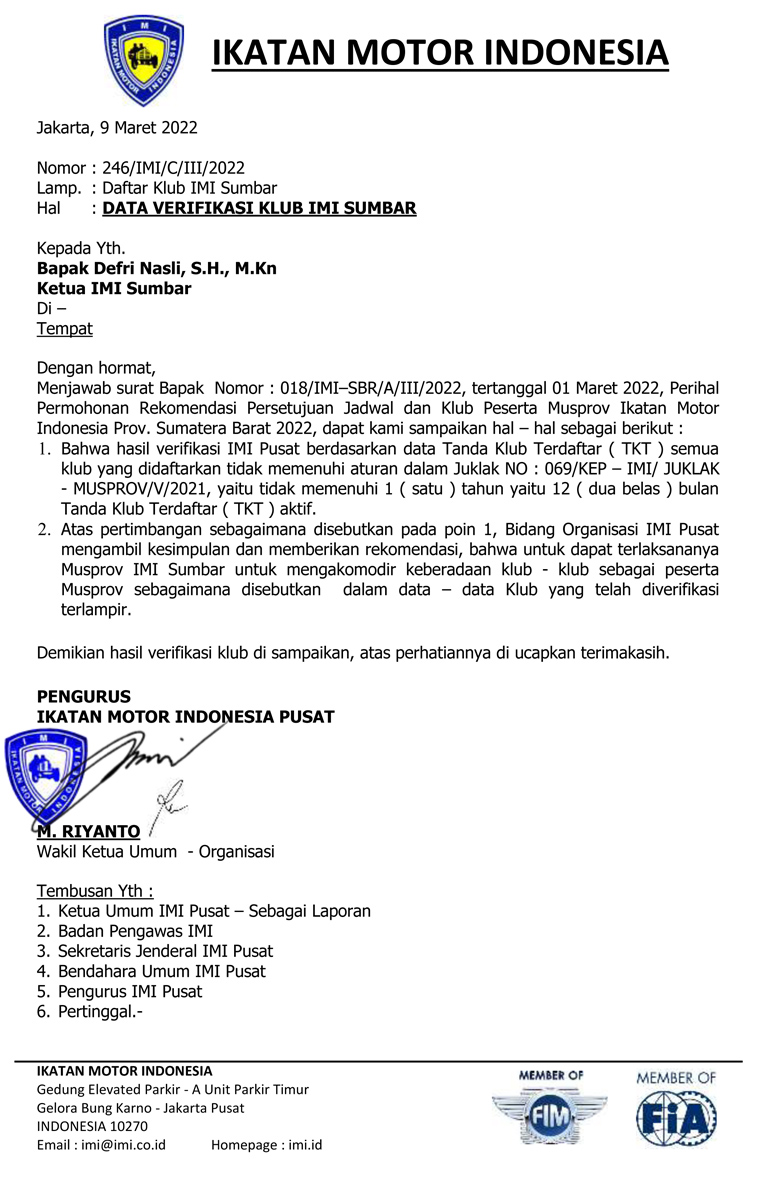 Lanjutnya” PP IMI menyatakan klub yang berhak mengikuti Musprov adalah sebanyak 62 klub. Selain itu, dalam surat PP IMI, tidak ada menyatakan permintaan penundaan oleh Pengprov IMI Sumbar perihal penundaan Musprov IMI Sumbar disetujui atau tidak. Artinya, tanggal 26 Maret 2022, Pengprov IMI Sumbar wajib melaksanakan Musprov tahun 2022,”