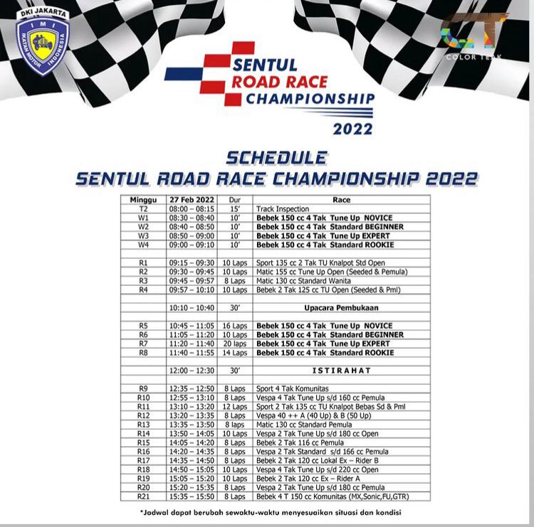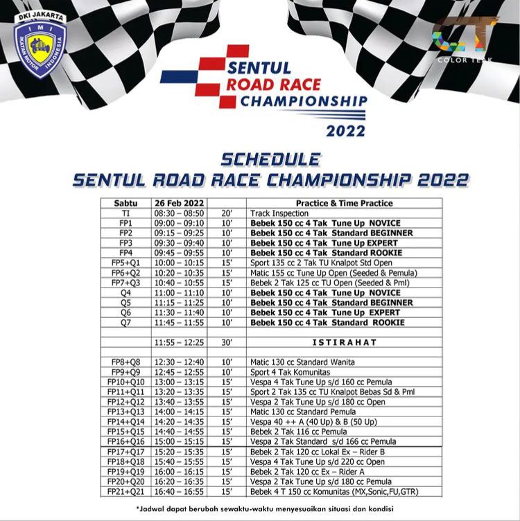 Pada hari sabtu ini sesi latihan bebas dan kualifikasi akan dijalankan peserta. Dan untuk kelas lainnya juga akan menjalani kualifikasi pada hari Sabtu (26/2) sedangkan Race akan diadakan pada hari minggu (27/2). Dan untuk mengetahui jadwal jelasnya, berikut jadawalnya: