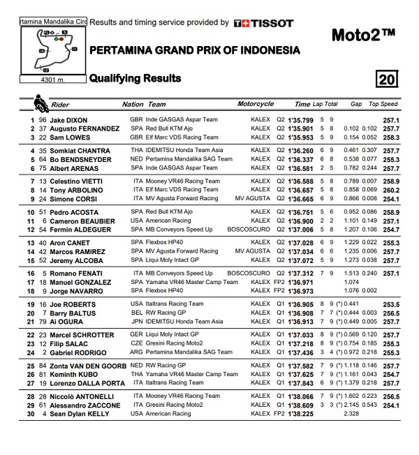 Dia catat waktu 1:35.799, catatan yang cukup baik untuk mengalahkan posisi kedua dari Augusto Fernandez bersama team Red Bull KTM Ajo. Gap sebesar 0,102 detik di susul Sam Lowes (Elf Marc VDS Racing Team) ada di posisi P3. Baik trek basah maupun trek kering Dixon bisa memaksimalkan motor yang ia bawa. Berikut hasil Kualifikasi yang baru saja selesai.