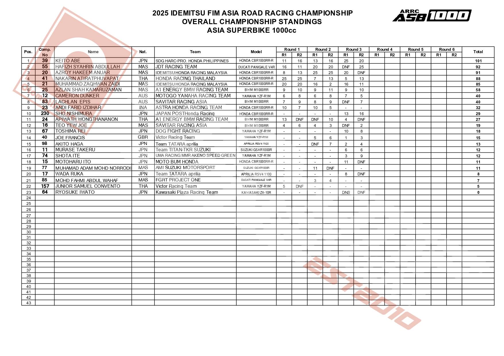 Namun, posisi ini belum sepenuhnya aman. Rival terdekatnya, Hafiz Syahrin Abdullah dari JDT Racing Team, mengintai ketat dengan torehan 92 poin. Selisih sembilan poin membuat persaingan perebutan gelar juara semakin memanas, terlebih masih ada tiga putaran lagi yang harus dijalani.
