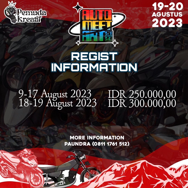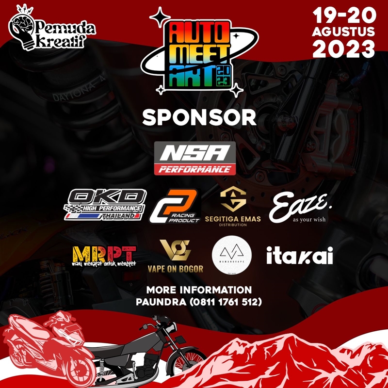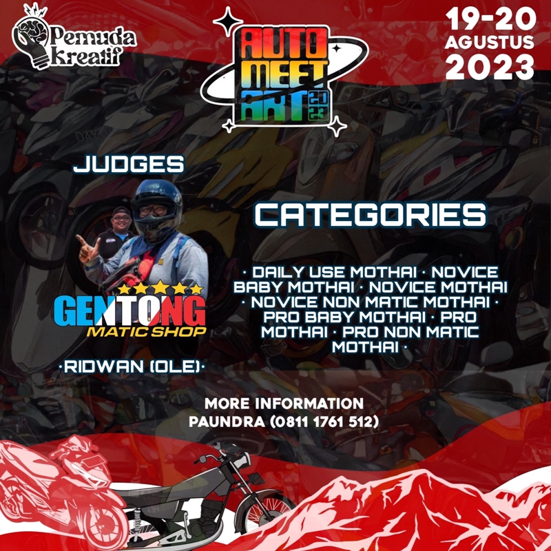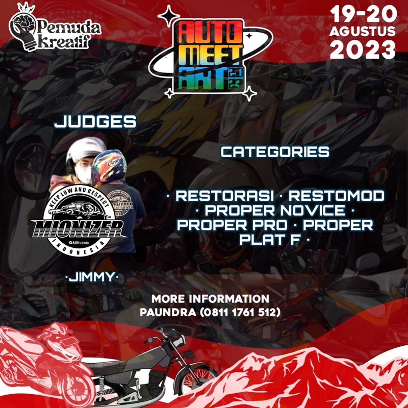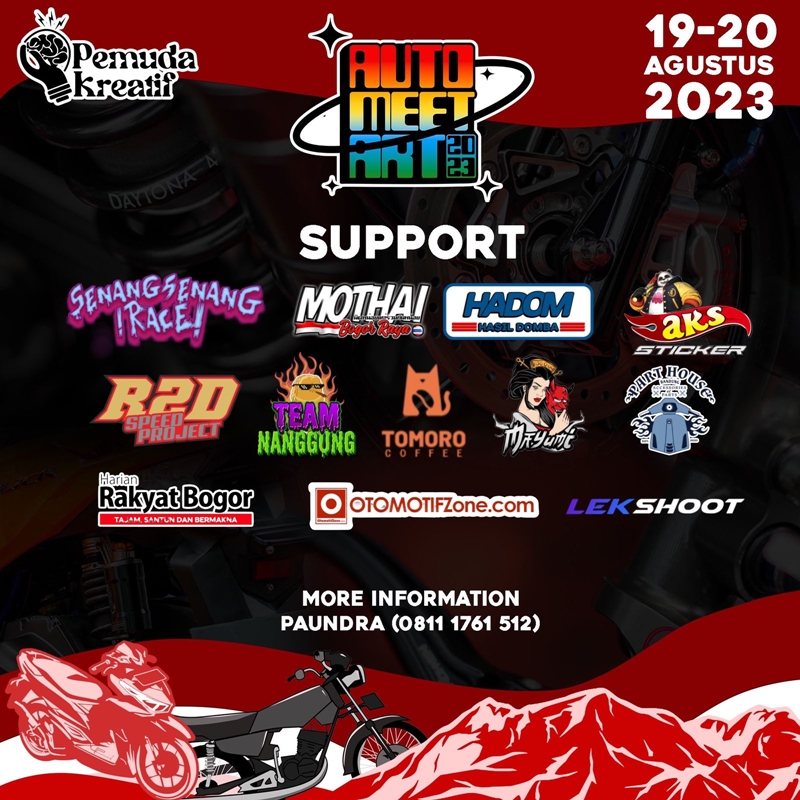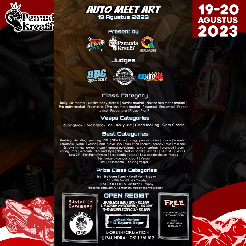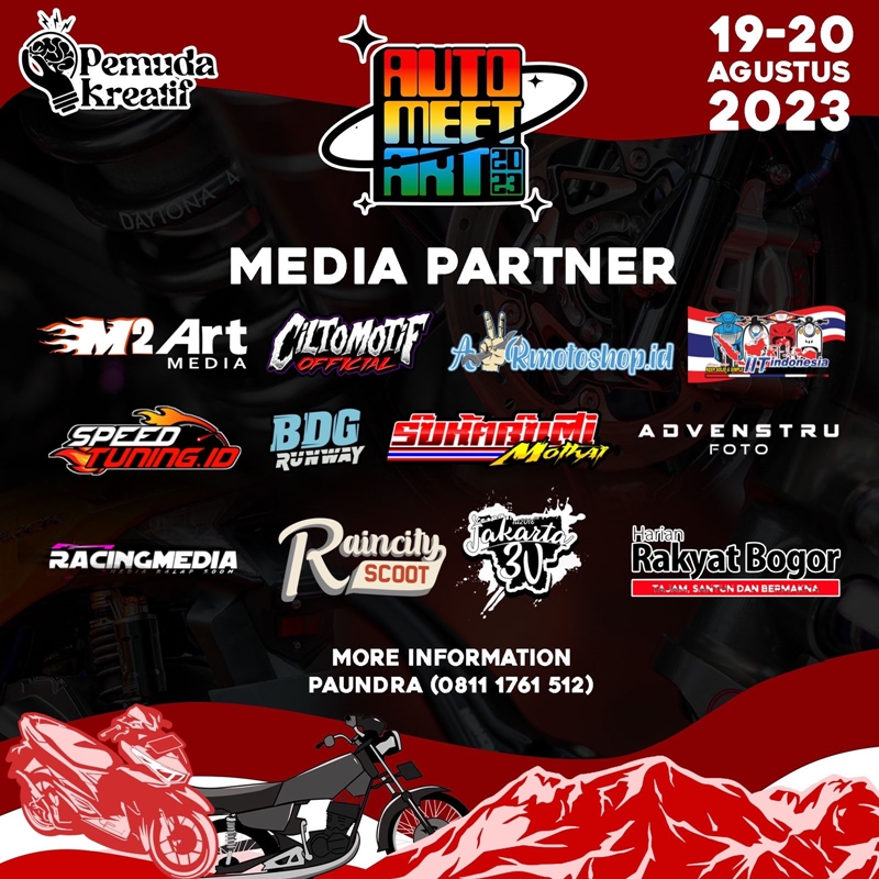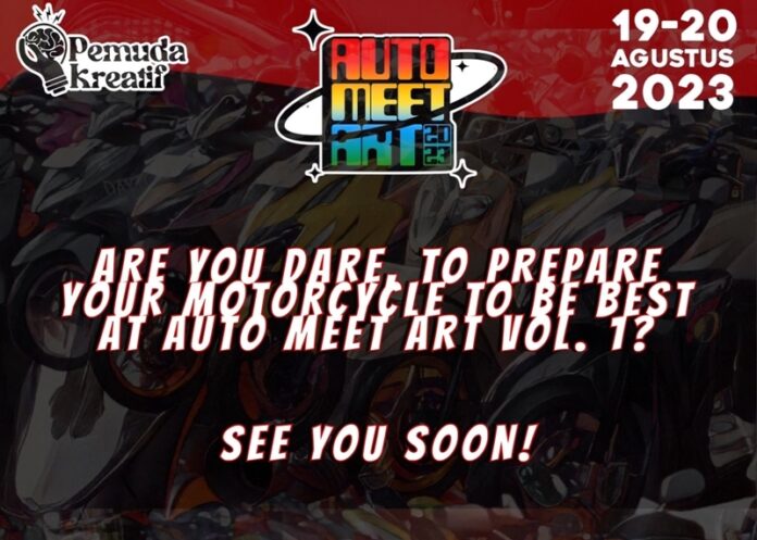 Penghujung pekan ini sebuah kontes modifikasi bertajuk Auto Meet Art, gagasan dari Pemuda Kreatif asal Bogor – Jawa Barat. Akan diadakan di Q-Square – Bogor, Jawa Barat. Sebanyak 17 kelas dari 8 eksibisi dan nantinya aka nada 45 best kategori dalam kegiatan tersebut.