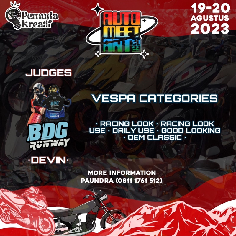 Untuk pertama kalinya juga, dalam acara Auto Meet Art dari Pemuda Kreatif ini, akan mengadakan kelas kategori Vespa, terdiri dari 5 kelas yang dilombakan. Di mana kelas ini belum pernah sama sekali diadakan untuk dilombakan dalam ajang adu penampilan di Bogor.