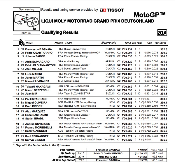 Tiga besar terakhir ada Johan Zarco yang terus konsisten sepanjang balapan di Sachsenring. Meski di urutan ketiga tapi pembalap satu negara dengan Fabio Quartararo ini cukup menjadi ancaman besok. Sementara rider yang sedang menjadi tranding topik musim ini tak lain Aleix Espargaro dan Aprilia cukup berpuas diri selesai di posisi keempat. Apapun besok bisa terjadi hal yang tak terduga selepas start. Sementara kita lihat dulu hasil kualifikasi.