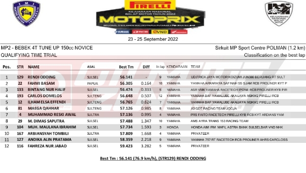 Kelas MP2 Bebek 4T TU 150cc Novice pada pembalap tuan rumah tersebut mencapai waktu terbaiknya 65.141. Rendi disusul Fahmi Basam gap 0.164 dan langsung di susul Bintang Nur Alif menempel ketat di posisi ketiga. Berikut hasil kualifikasinya.