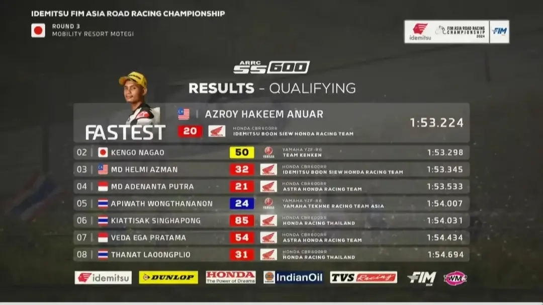 OtomotifZone.com – Jepang. Seri 3 Asia Road Racing Championship Sirkuit Motegi Jepang 8 Juni 2024 kembali ke Sesi kualifikasi kelas ss600 yang sebagian besar dari kita terus memantau pembalap dari Indonesia. Di kelas ini tetap masih ada empat pembalap Indonesia salah satunya yang cukup menekan posisi 3 besar adalah Muhammad Adenanta Putra dari Astra Honda Racing Team.