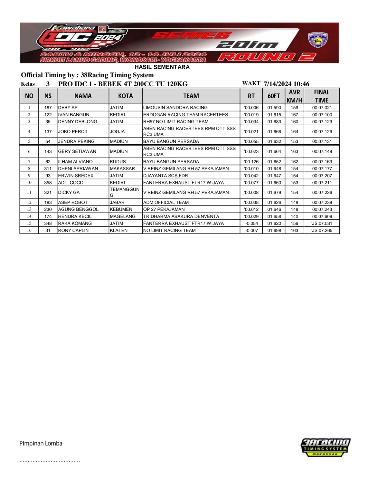 Perlu diketahui bahwa Seri pertama Kawahara Djava K2R IDC 2024 gagal mendapat podium terhormat namun masih di 5 besar terbaik, Fu berlapis cat biru tersebut juga memimpin babak kualifikasi.