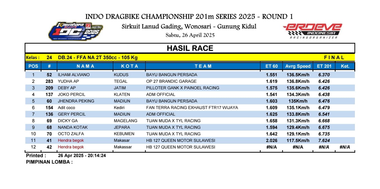 Wonosari – Seri pertama Kawahara Djava K2R IDC 2025 di Sirkuit Lanud Gading, Wonosari, Gunungkidul, jadi saksi aksi ciamik dari Ilham Alviano, alias Ilham Unyil. Pembalap asal Kudus ini berhasil nembus waktu 6,370 detik di kelas FFA NA 2T 350cc (105 kg), bawa Ninja FFA racikan Yahya TYL Racing.