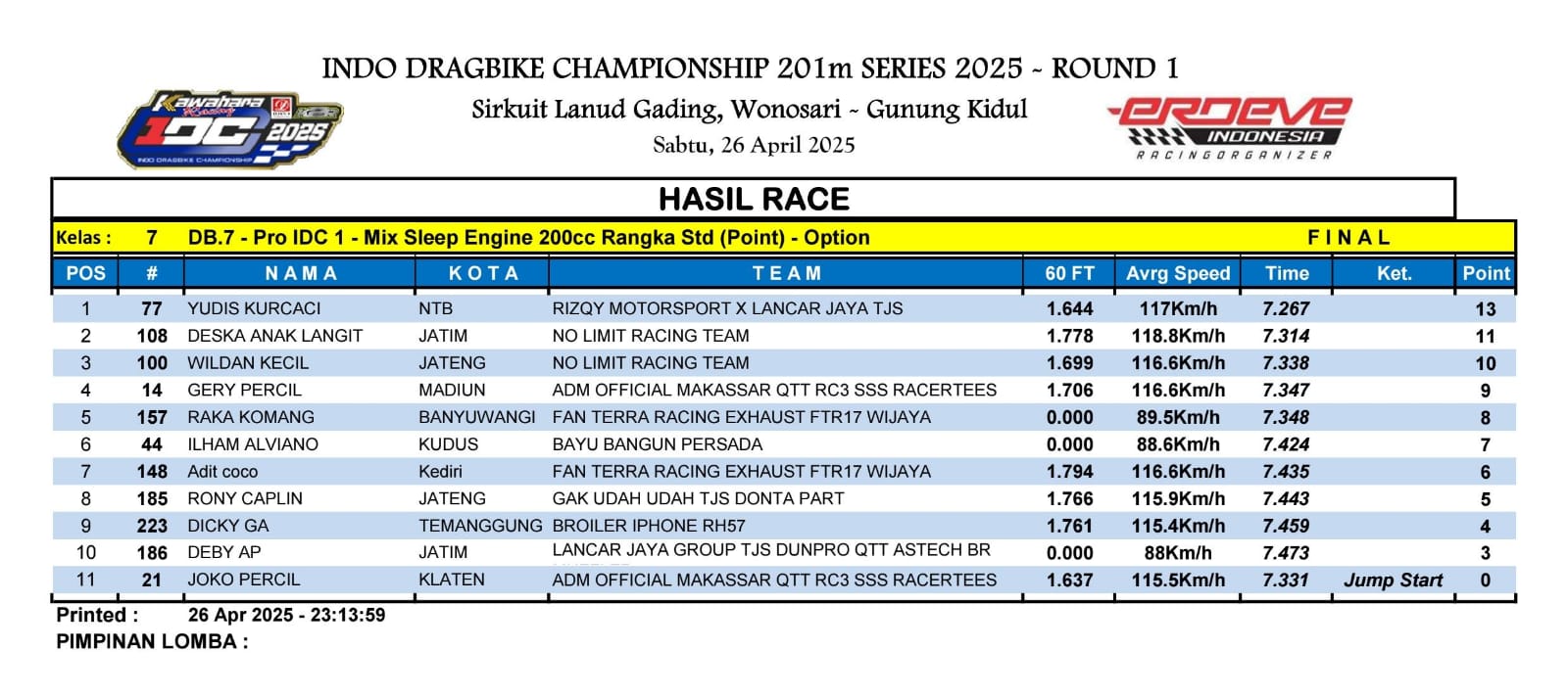 Pada ajang balap Kawahara Djava K2R IDC 2025 Seri Pertama, Yudies Kurcaci pembalap asal Lombok dipercaya penuh Farid TJS untuk mengeksekusi Jupiter 200cc garapannya mengusung nama tim Rizky Motorsport Lancar Jaya TJS