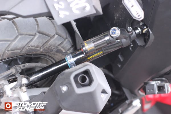 Dua jenis untuk shock depan dan shock belakang. Untuk bagian depan tetap memakai tabung beserta as Honda ADV150. Cuma dalemannya +Add Suspension punya menu sendiri. “Spring (per) dan ada cartridge sama rebound, jadi ada setelan kompresi. Mudahnya buat setelan cepat bisa sesuaikan kekenyalan langsung tanpa bongkar,” ucap Dede Widya Purnama yang punya nama bengkel +Add Suspension.