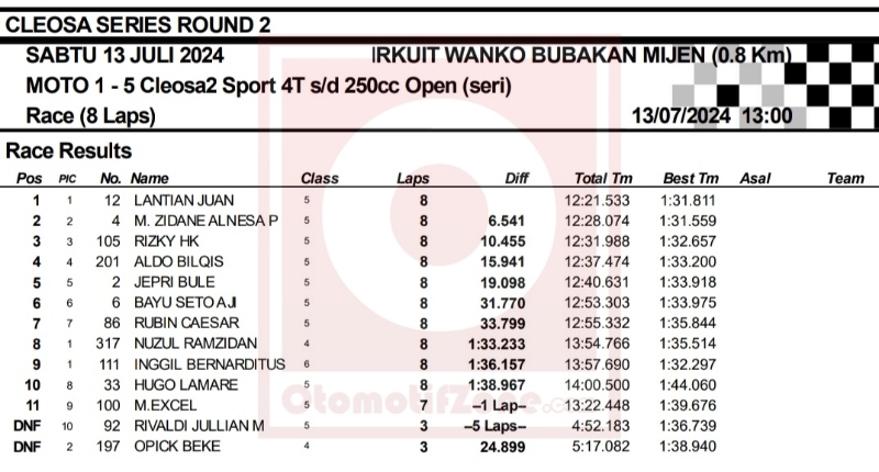OtomotifZone.com – Semarang. Hari pertama Seri 2 Cleosa Grasstrack Motocross 13-14 Juli 2024 kelas utama sudah di laksanakan. Seperti kelas Sport 4T 250cc Open. Nama Lantian Juan langsung mencuat. Dia kembali mendominasi awal pembuka di kelas Open, Lantian Juan berhasil menangi moto 1 kelas Sport 4T s/d 250cc Sirkuit Wanko, Bubakan, Mijen, Kota Semarang.