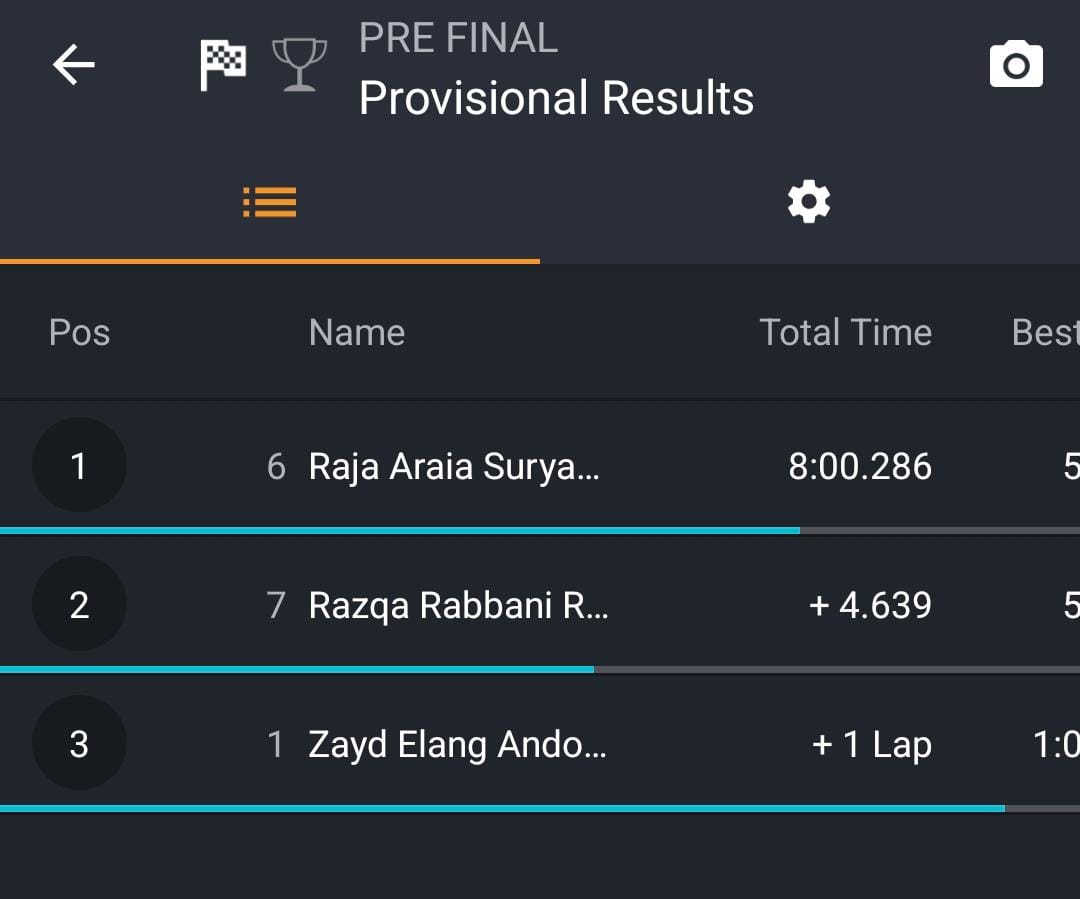 Namun berkat fokus dan konsistensi, Raja perlahan mulai meninggalkan lawan-lawannya. Kecepatan stabil di tiap lap membuat jarak dengan Razqa terus melebar hingga bendera finis dikibarkan.