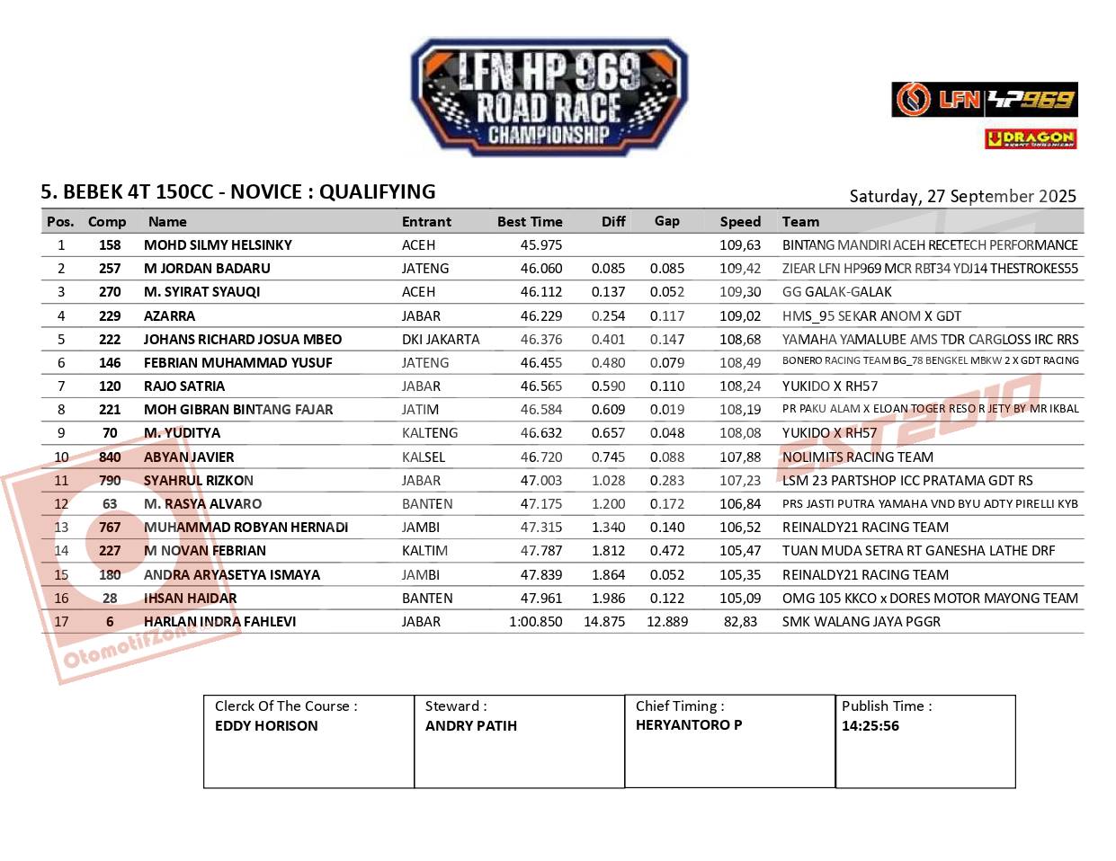 OtomotifZone.com – Semarang, Persaingan panas tersaji di kelas Bebek 4T 150 Novice pada sesi kualifikasi LFN HP969 Road Race Championship 2025 seri 2 yang digelar di Sirkuit Mijen, Semarang. Dari sekian nama yang bertarung, Silmi, pebalap asal Aceh, berhasil keluar sebagai yang tercepat dan sukses mengamankan pole position untuk race hari Minggu.