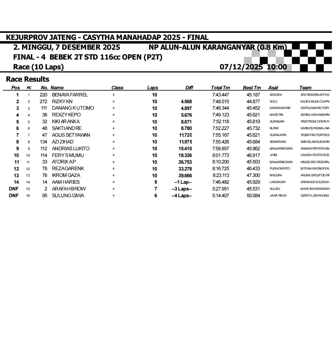 OtomotifZone.com– Karanganyar. Salah satu kelas point di Final Casytha Manahadap Road Race sirkuit Alun-alun Kota Karanganyar 6-7 Desember 2025 di menit awal gas di kelas Bebek 2T STD 116cc Open. Persaingan Point tetap tertuju pada Agus Setyawan, Rizky KN, dan Benaya Farrel.