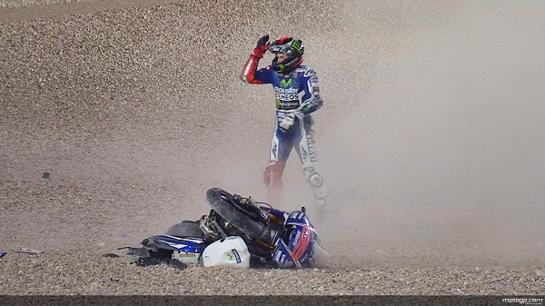 OtomotifZone.com – Losail. Juara dunia 2010 dan 2012 MotoGP harus tersingkir dari lintasan di seri perdana MotoGP Qatar 2014. Akibat ban depan yang belum cukup panas atau bersahabat dengan lintasan di Losail Qatar membuat Lorenzo harus terjatuh di tikungan ke-15 yang sebelumnya pembalap Movistar Yamaha sedang memimpin jalannya balapan.