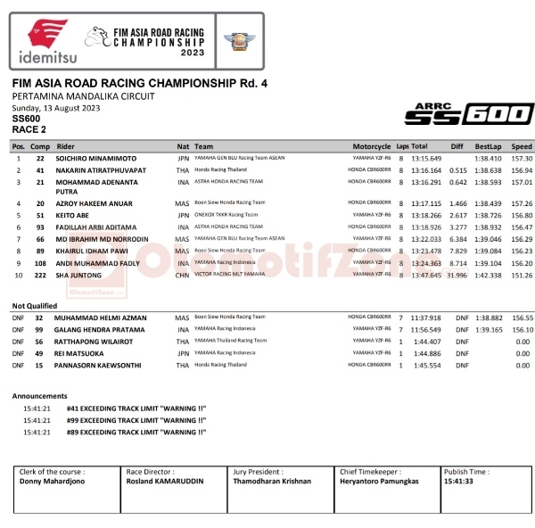 OtomotifZone.com-NTB. Race kedua Supersport atau SS600 di Asia Road Racing Championship 2023 sirkuit Mandalika Nusa Tenggara Barat 13 Agustus 2023 agak berbeda dengan situasi di ras pertama hari Sabtu kemarin. Sosok duet Astra Honda Racing Team mengawali race di urutan 3 besar. Mereka adalah Fadilah Arbi Aditama dan Muhammad Adenanta.