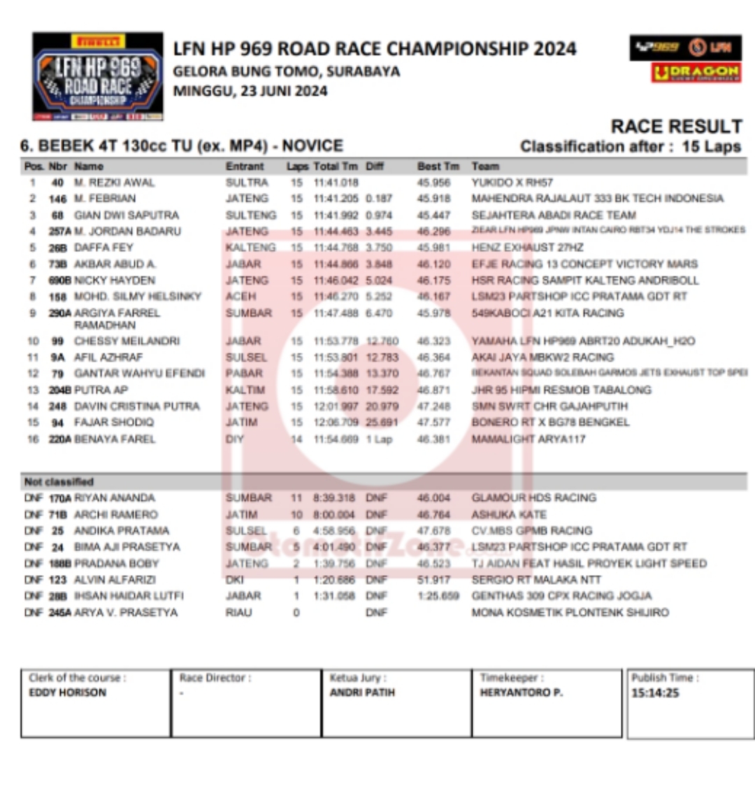 OtomotifZone.com – Surabaya. M. Rezki berhasil meraih kemenangan dramatis di kelas Bebek 4T 130cc Novice pada ajang LFN HP 969 Road Race Championship yang berlangsung di Sirkuit GBT Surabaya. Kemenangan ini didapatkan setelah Gian Dwi Saputra, yang sempat memimpin balapan dengan keunggulan sekitar 4 detik, mengalami masalah teknis beberapa meter sebelum garis finish.