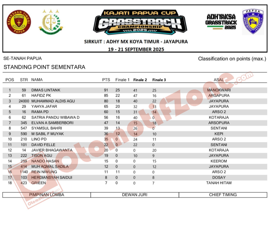 - Dimas Lintang (Mambramo Tengah Racing Team) menutup persaingan Kategori Se Tanah Papua dengan 91 poin, setelah tampil solid di akhir sesi Kajati Papua Cup.