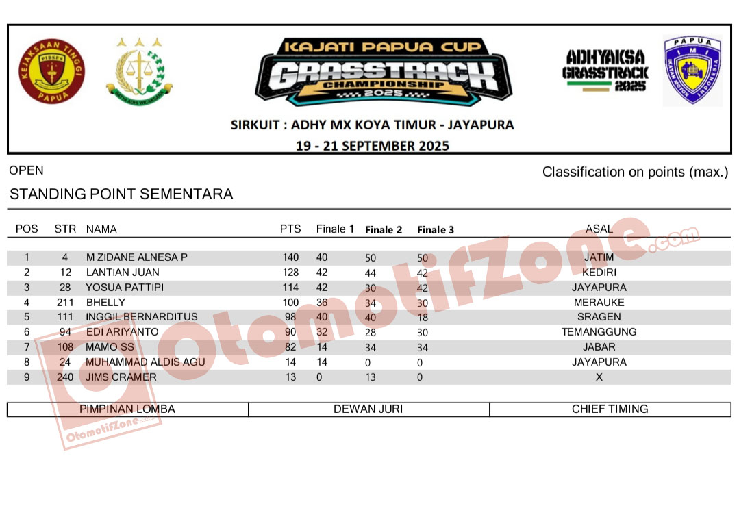 OtomotifZone.com – Jayapura. Sejarah baru tercipta di ajang Kajati Papua Cup Grasstrack Championship 2025 Jayapura yang berlangsung di Sirkuit Adhi MX Koya Timur, Jayapura 19-21 September 2025. Menjadi suatu pertarungan sangar kembali dimana nama M. Zidan Alnesa memimpin klasemen Kategori Open pada kejuaraan bergengsi tersebut.