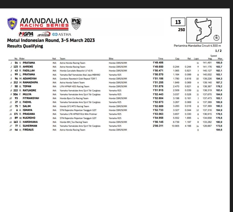 Selisih sangat tipis didapat oleh rekan satu timnya Rheza Danica. Pebalap asal Yogya itu juga mampu menempatkan dirinya di barisan depan. Rheza tempel Veda dengan raihan waktu 1.49.650. Agar lebih jelas berikut hasil kualifikasinya: