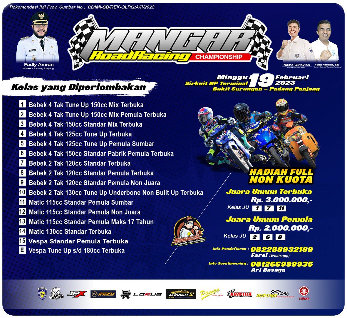 OtomotifZone.com – Padang. Gelaran Mangar Road Race Championship sangat sayang bila dilewatkan. Karena gelaran ini akan memberikan hadiah non kuota. Gelaran tersebut akan berjalan (19/2/22) di Sirkuit NP Terminal Bukit Surungan, Padang Panjang. Yang gila lagi selain hadiah non kuota, ada juga hadiah juara umum untuk kalian semua.