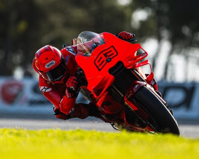Marquez mengambil bagian dalam uji coba pertamanya bersama tim pabrikan Ducati dengan sepeda motor dan perlengkapan yang sama sekali tidak memiliki ciri khas sponsor pribadinya.