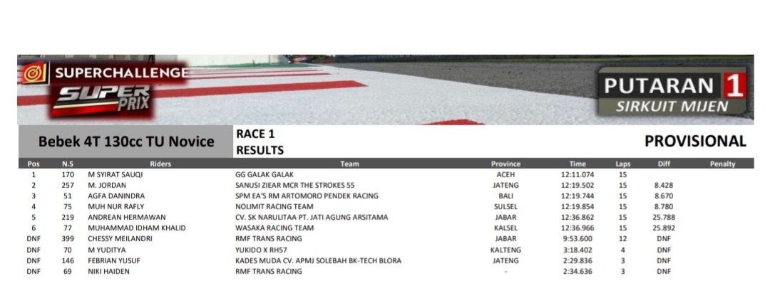 Hasil tiga kemenangan novice di race pertama menunjukkan hasil positif untuk race kedua malam nanti. Satu-satunya pembalap yang di Bawa GG Galak Galak Pekanbaru ini bisa lebih konsisten karena team terfokus satu pembalap saja.