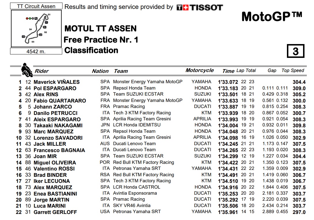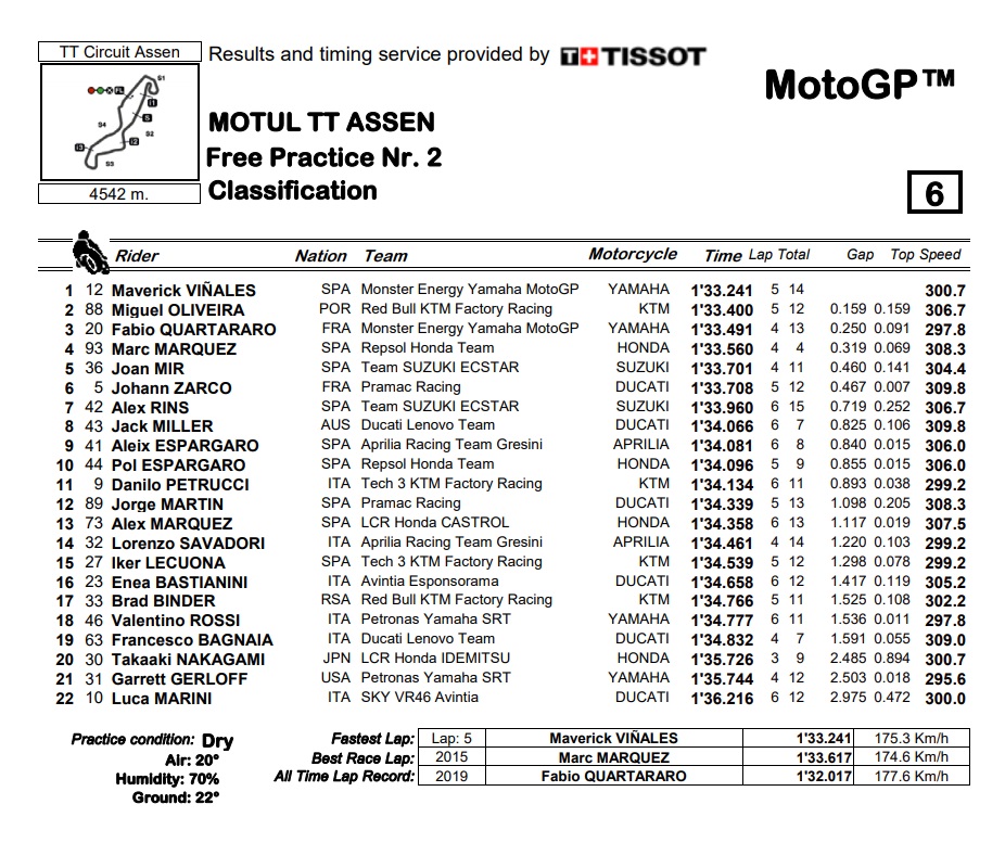 Di Free Practice 2 mungkin dia sedikit mempunyai keuntungan karena dalam sesi tersebut ada dua kondisi. Kering dan basah. Saat kering Vinales langsung panteng throtle habis seperti saat sesi FP1. Dan hasil kombinasinya dia tetap di catat pada urutan pertama. Berikut hasil FP1 dan FP2.