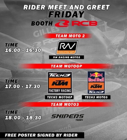 Seperti dari sponsor MotoGP RCB alias Racing Boy. Produk Malaysia yang dipegang pemasaran Indonesia, oleh PT. Enwan Multi Partindo, akan memanjakan para penggemar balap bergengsi dunia motor, dengan mengadakan meet and greet bersama Pebalap MotoGP, Moto2, dan Moto3. Bukan hanya Pebalap tapi juga bersama timnya.