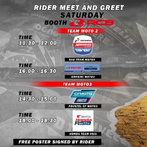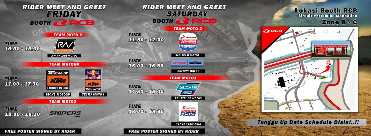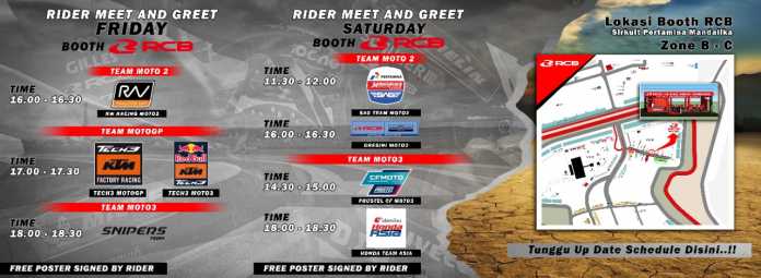 Yuk kunjungi booth RCB, lokasinya di Zone B-C. Akan dilaksanakan selama 2 hari, sampai menjelang bergulirnya balapan. Jangan sampai terlewat!!! Simak di bawah ini.