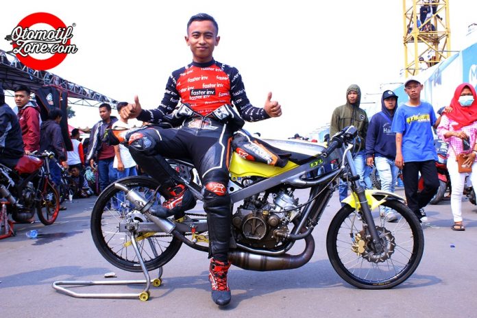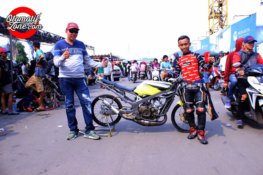 OtomotifZone.com – Meikarta. Joko Percil memang peembalap pemula berbahaya. Akhir pekan kemarin saja dirinya mampu menjadi yang tercepat di kelas Ninja 2T 155 Frame STD Pemula di Meikarta Drag Bike 2018 (29/7) di Meikarta, Cikarang. Pembalap jebolan GDS ini mampu menjadi yang tercepat dengan menggunakan kuda pacu Bayu Bangun Persada yang andalkan knalpot perut besar milik ABRT20.