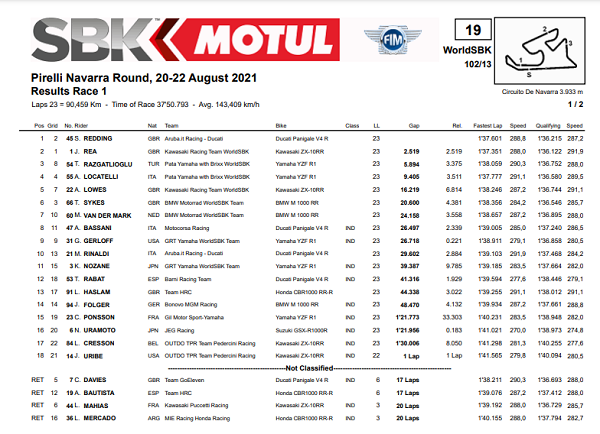 Redding yang start dari posisi dua di belakang Johny Rea sanggup mengubah posisi akhir balap. Rea nampak kesulitan mengejar ambisi Redding yang tahun depan bakal duduk di atas jok BMW. Berikut ini hasil racenya.
