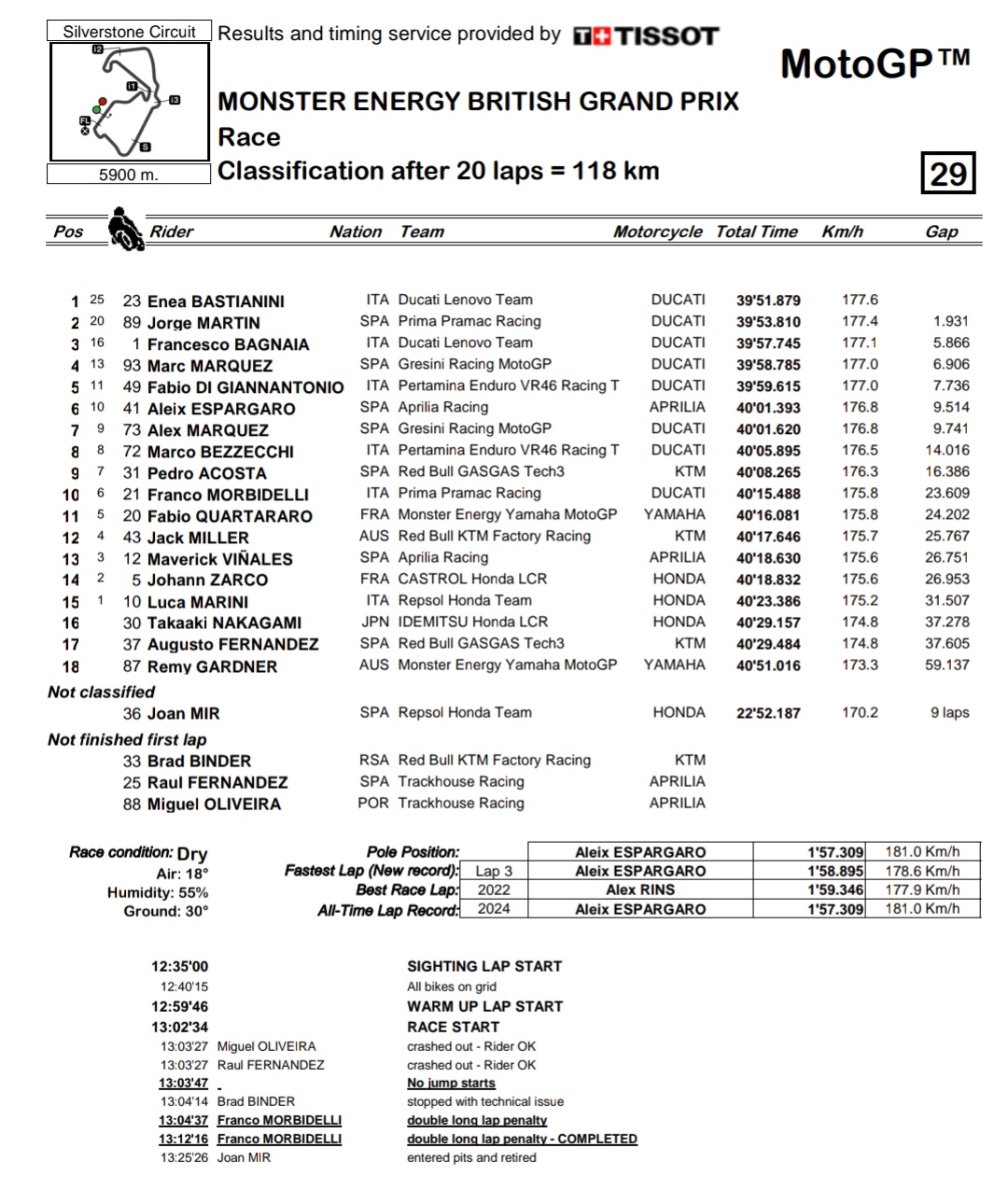 OtomotifZone.com – Inggris. MotoGP Silverstone 4 Agustus 2024 kembali merapatkan point antara Pecco Bagnaia dengan Jorge Martin setelah sprint race kemarin. Dikarenakan Pecco mengalami insiden terjatuh dan tidak bisa melanjutkan balap sehingga ia tidak membawa poin sama sekali. Jorge Martin meskipun tidak juara tapi dia bisa di posisi runner up berhasil menipiskan lagi ke poin yang sempat Tertinggal dari Jerman kemarin.