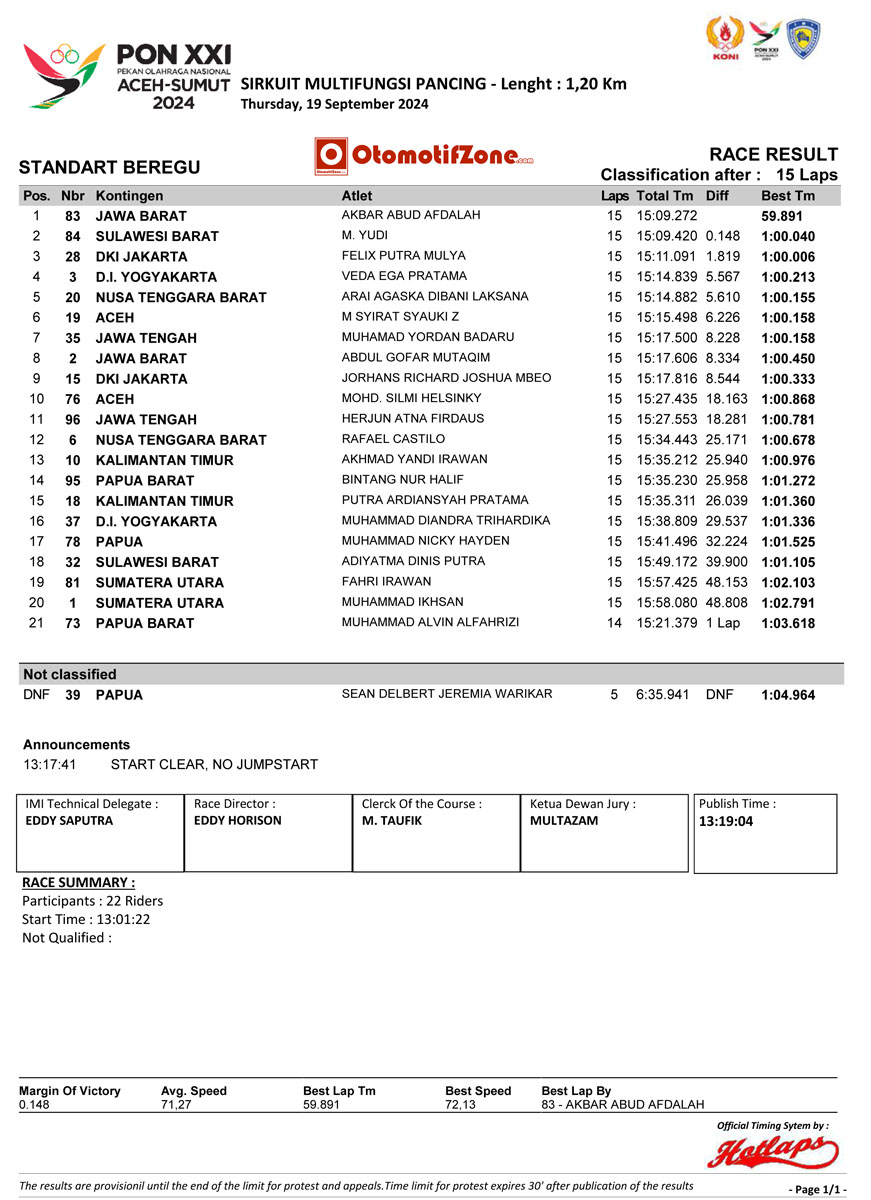 OtomotifZone.com-Medan. Berbekal point kecil hasil QQT dengan hanya 7 point dari perhitungan Akbar Abud tercepat pertama dan Abdul Gofar tercepat ke-6, dalam laga final kelas disiplin bermotor Standard Beregu, kedua pembalap menjalani strategi dengan konsisten, hanya selisih 2 point dari hasi QTT, Jabar akhirnya meraih medali emas diajang PON XXI Aceh Sumut 2024 yang baru usai dilaksanakan beberapa menit yang lalu, Kamis, 19 September 2024 di sirkuit Multi fungsi Pancing, Medan Sumatera Utara.