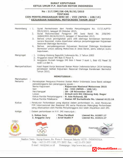 Keputusan tersebut juga sudah dituangkan dalam surat keputusan PP IMI tertanggal 29 Oktober 2015 juga sudah jelas bahwa penyelenggaraan seri 8 digelar ditempat tersebut, meski OZ sempat mengamati di Medsos, bahwa di wilayah pengprov IMI Jateng juga sudah santer akan digelar Final Race kejurnas Motocross yang akan digelar tanggal 12-13 Desember 2015 di sirkuit Option Platinum Plesungan Karanganyar Jawa Tengah, sudah selesai..??? ternyata belum broo…