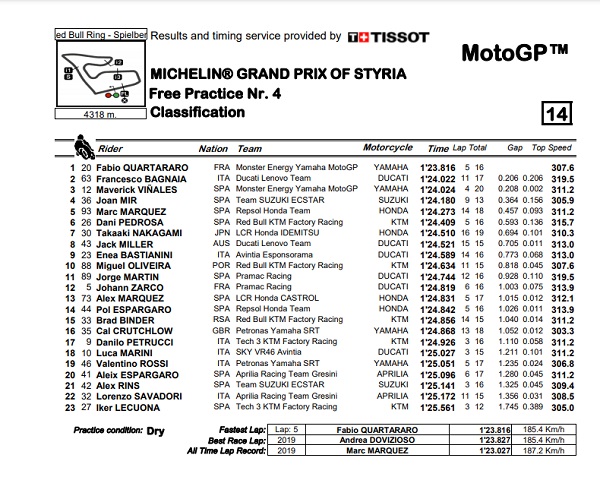 Dan pembuktian Fabio berhasil sebagai pembalap tercepat di FP4 baru saja. Pembalap Prancis yang tahun depan menjadi rider utama Monster Energy Yamaha ini mencatat 1’23.816. Walau lebih lambat dari torehan waktu di FP3 Fabio berhasil di atas Francesco Bagnaia.