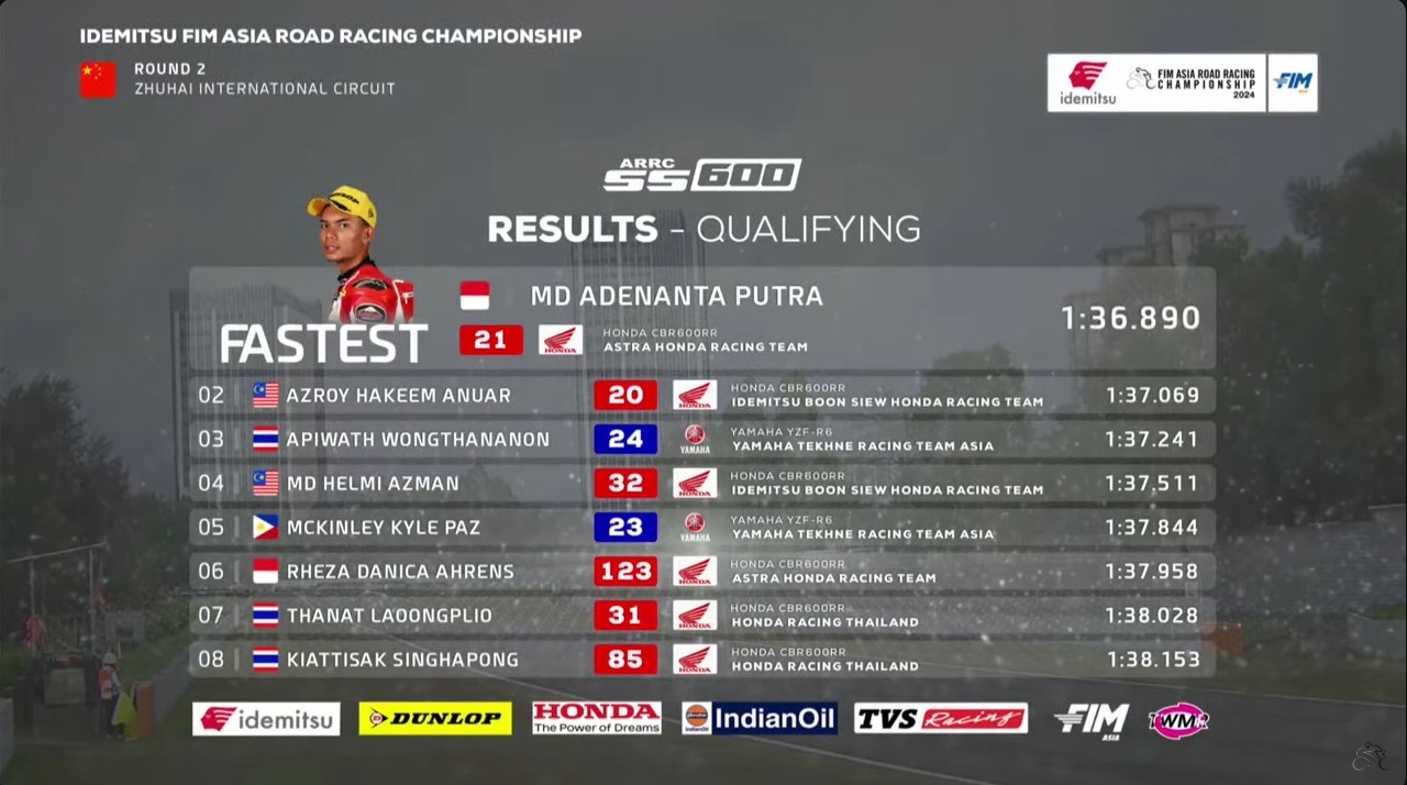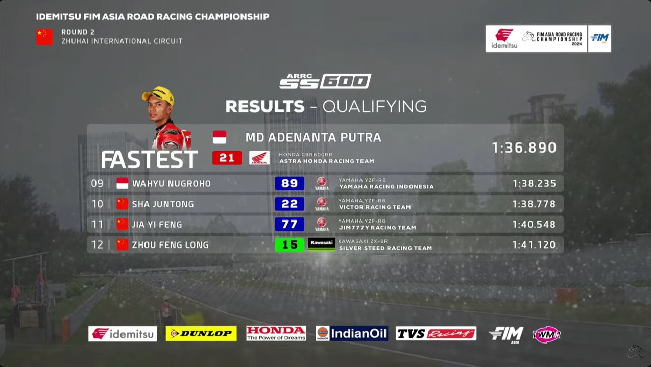 OtomotifZone.com – Zhuhai. Lanjut kelas selanjutnya seri kedua ARRC – Asia Road Racing Championship sirkuit Zhuhai, China sesi kualifikasi hari ini 20 April 2024 di Supersport 600cc. Nama M. Adenanta terus berada di posisi teratas sejak waktu di gulirkan. Pembalap Astra Honda Racing Team tersebut cukup sulit di tembus pembalap lain.