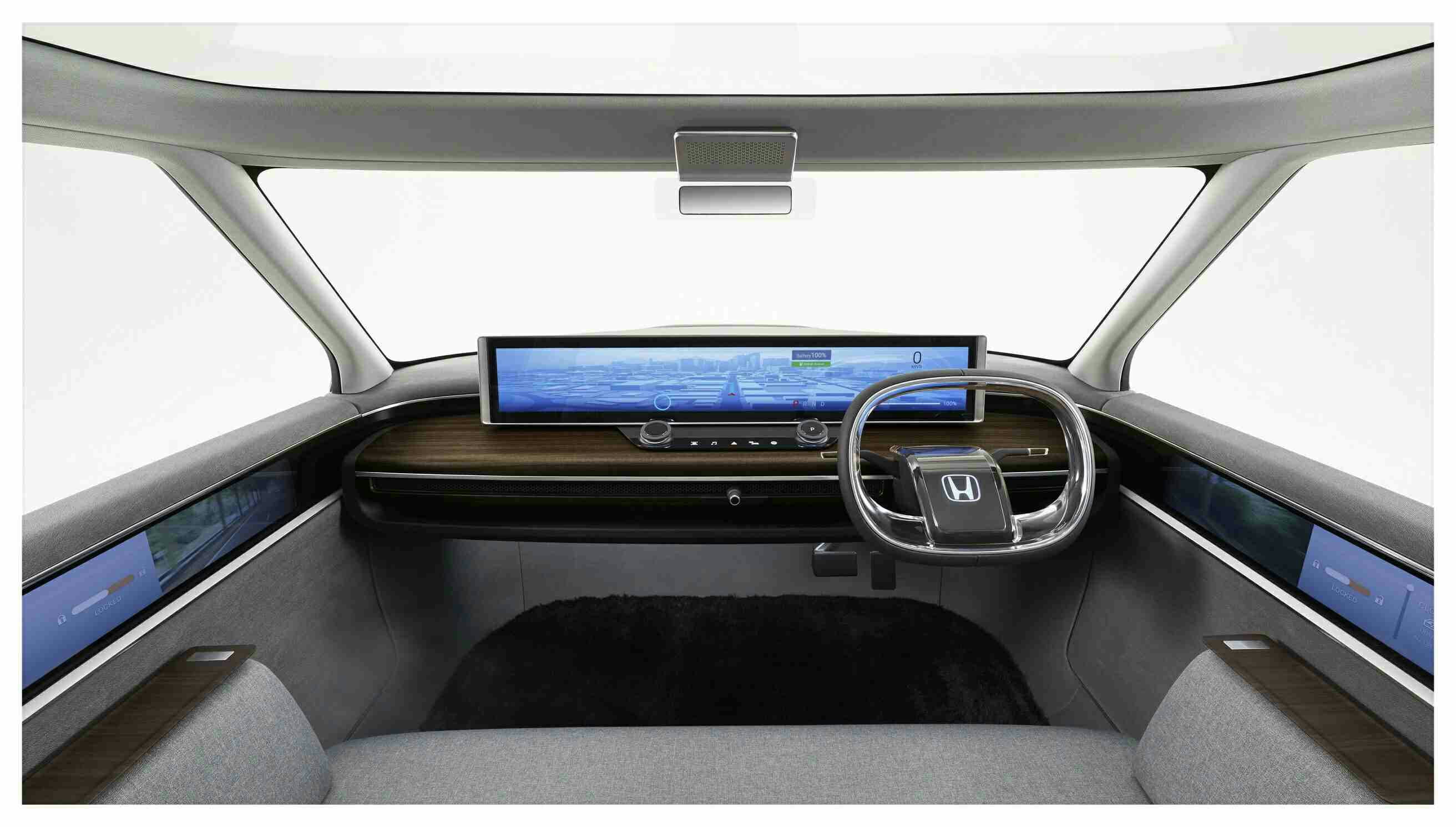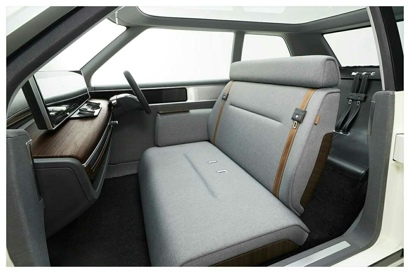 Di dalamnya, empat penumpang dapat diakomodasi dengan dua baris bangku berlapis kain abu-abu dan aksen kayu yang klasik untuk memberikan kesan nyaman dan modern. Di bagian dashboard terdapat layar yang melebar dari ujung ke ujung untuk menampilkan beragam informasi dan kapasitas baterai yang tersisa, serta terdapat layar di bagian dalam pintu yang berfungsi sebagai spion yang tersambung melalui kamera digital.