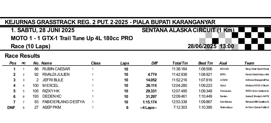 OtomotifZone.com – Karanganyar. Race pembuka kelas utama di Seri 2 Kejurnas Grasstrack Region 2 sirkuit Sentana Alaska, Mojogedang, Karanganyar 28 Juni 2025 di awali sebuah kelas dari kalangan senior. Moto 1 Trail 4T Tune Up 180 Pro sosok Rubin Caesar kembali menjadi rider yang berhasil menyambung hasil baik seri sebelumnya di Pandeglang Banten dua pekan lalu.
