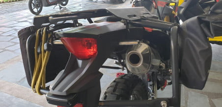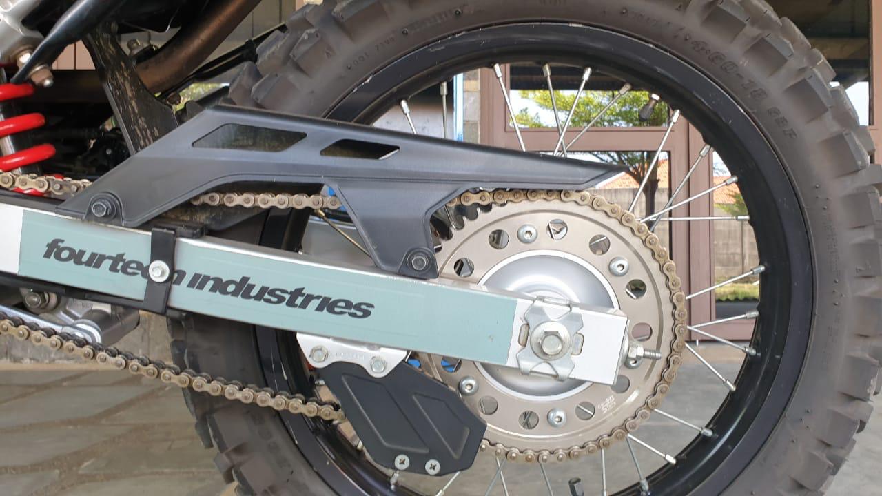 Selanjutnya di perangkat handle rem depan, handle kopling, foot step, serta pedal rem belakang dari produk variasi berlabel Xpedition. Untuk Lift Strap pasang dari merek Giant Loop. Wadah simpan barang alias Tankbag dari produk Enduriztan type Sandstorm 4X yang kini nampak lebih pas dengan aksen motor trailnya. Besi penyangga barang alias Siderack dan juga Tailrack dari merk M15.