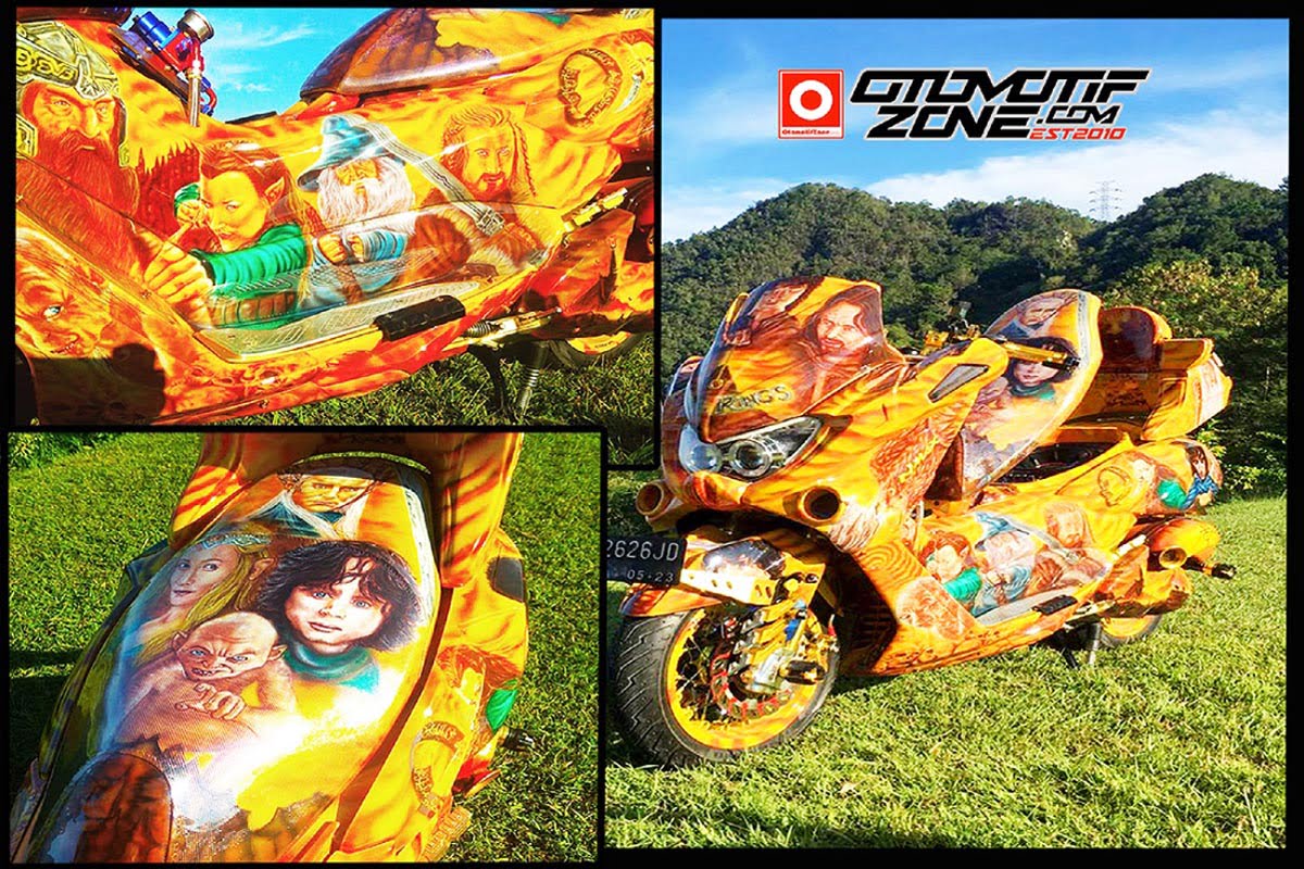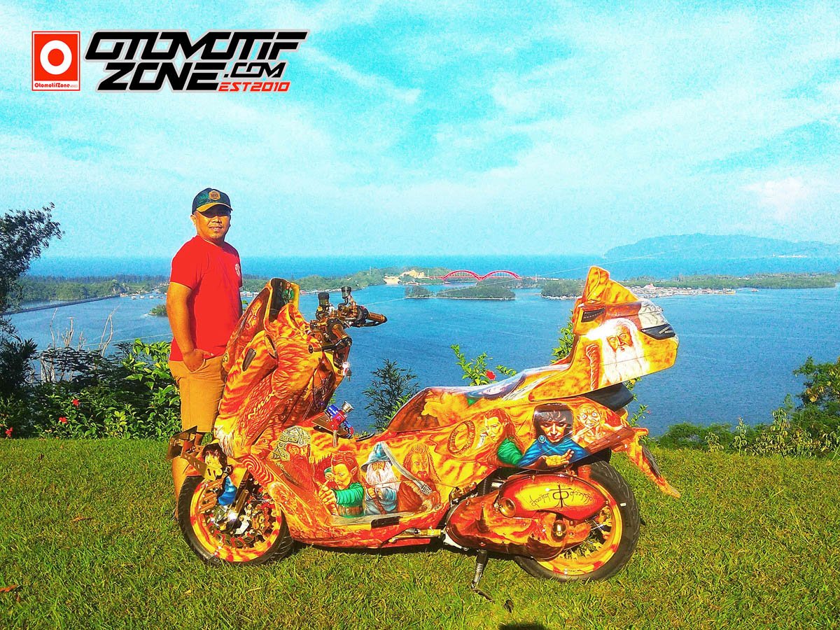 Seperti di rasakan oleh Noverianto Karangan, yang nampaknya semakin ketagihan dalam merombak wujud Yamaha NMax lansiran 2018 miliknya dengan tampil modis. Tengok saja tampang dari skutik berbodi gambot ini yang sekarang telah terlihat makin exclusive dengan kesan body custom yang di labur coretan airbrush bermotif realis dengan mengambil tema film animasi “The Lord Of The Ring”.