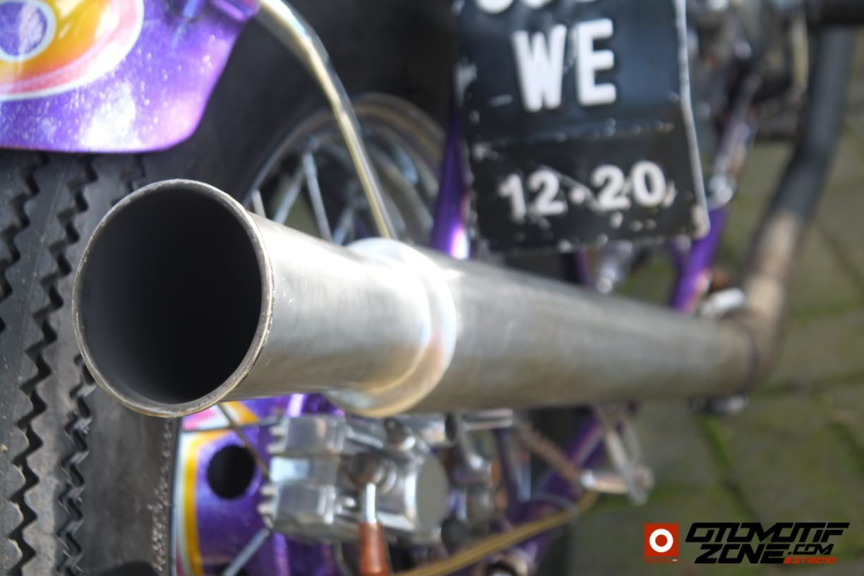 “Sebelumnya awal membuat sasis rigid ini untuk di jejali oleh mesin Binter Merzy, namun saya juga akali lagi agar bisa ditempelkan dengan mesin SR400. Baru pas ada rejeki lebih, saya bisa tebus mesin tersebut dan langsung pasangkan ke sasis kustom ini,” tukas Wawan yang juga punya usaha sampingan yaitu berjualan tromol kustom berdiameter lebar ini.