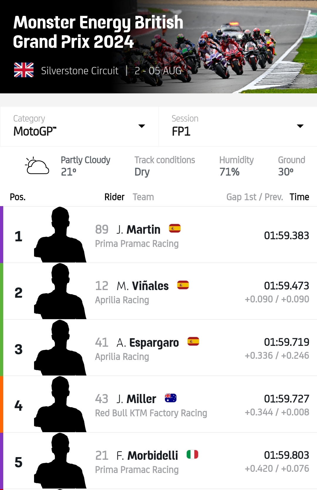 Jorge Martin berhasil mencatatkan waktu tercepat setelah sebelumnya harus berjuang extra untuk bisa mengambil alih posisi teratas dari duo Aprilia yang sebelumnya keduanya berhasil memimpin jalannya FP 1 dengan selisih waktu hanya 0.001 detik, wooww….