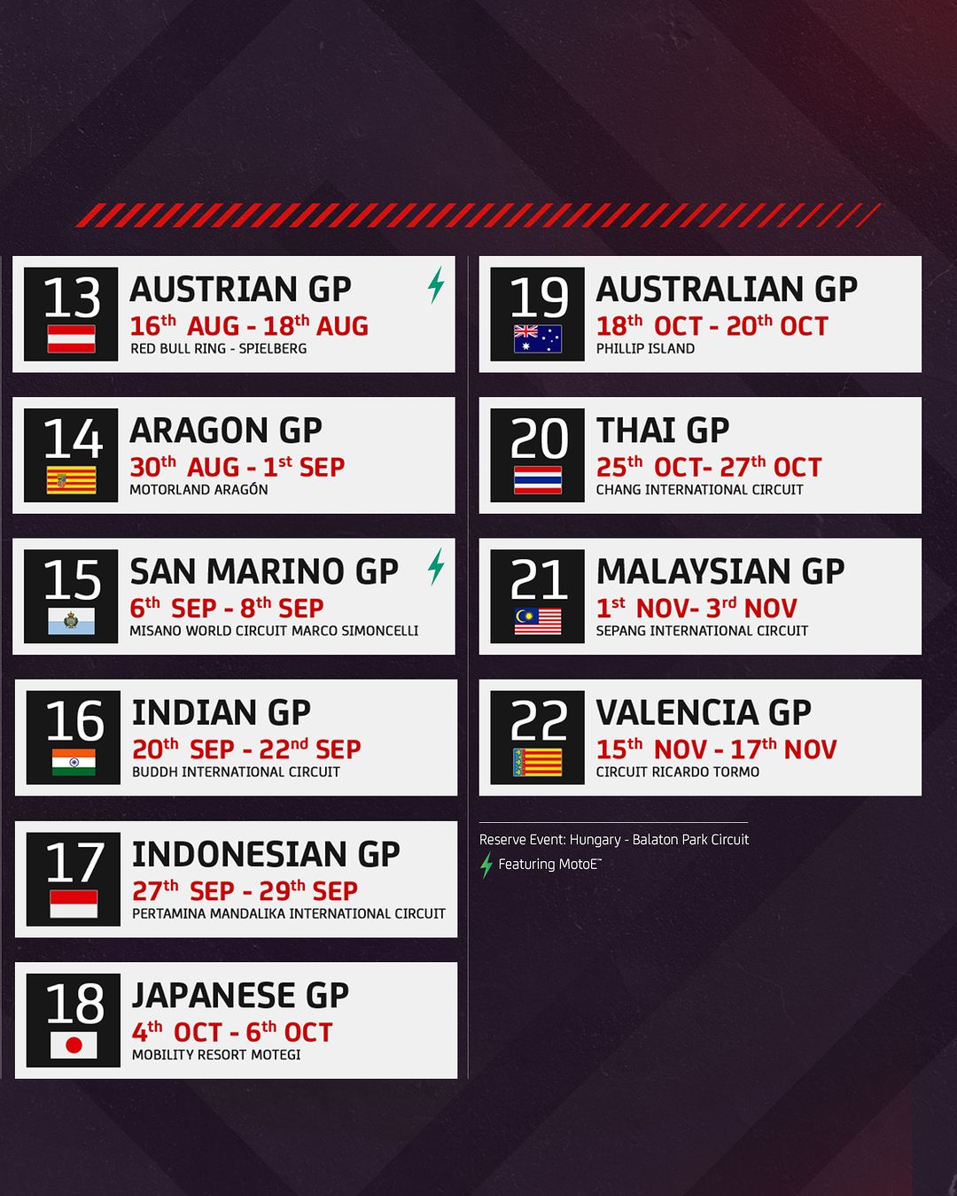 Indonesia sendiri berada pada putaran ke-17, tentunya di Sirkuit Pertamina Mandalika Lombok. Akan berlangsung pada September mendatang. Buat para penggemar MotoGP di Indonesia, persiapkan waktu dan budgeting kalian agar bisa menyaksikan secara langsung.