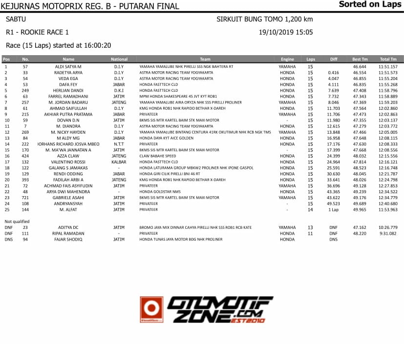 OtomotifZone.com-Surabaya. Final Kejuaraan Nasional Motoprix 2019 Region B (Jawa) yang berlangsung di sirkuit Gelora Bung Tomo,Surabaya (19/10). Terjadi Drama saling kejar-kejaran pada Race Satu di Kelas Rookie,Aldy Satya Mahendra Juaranya dan mampu ungguli Radeta Arya Khafi.